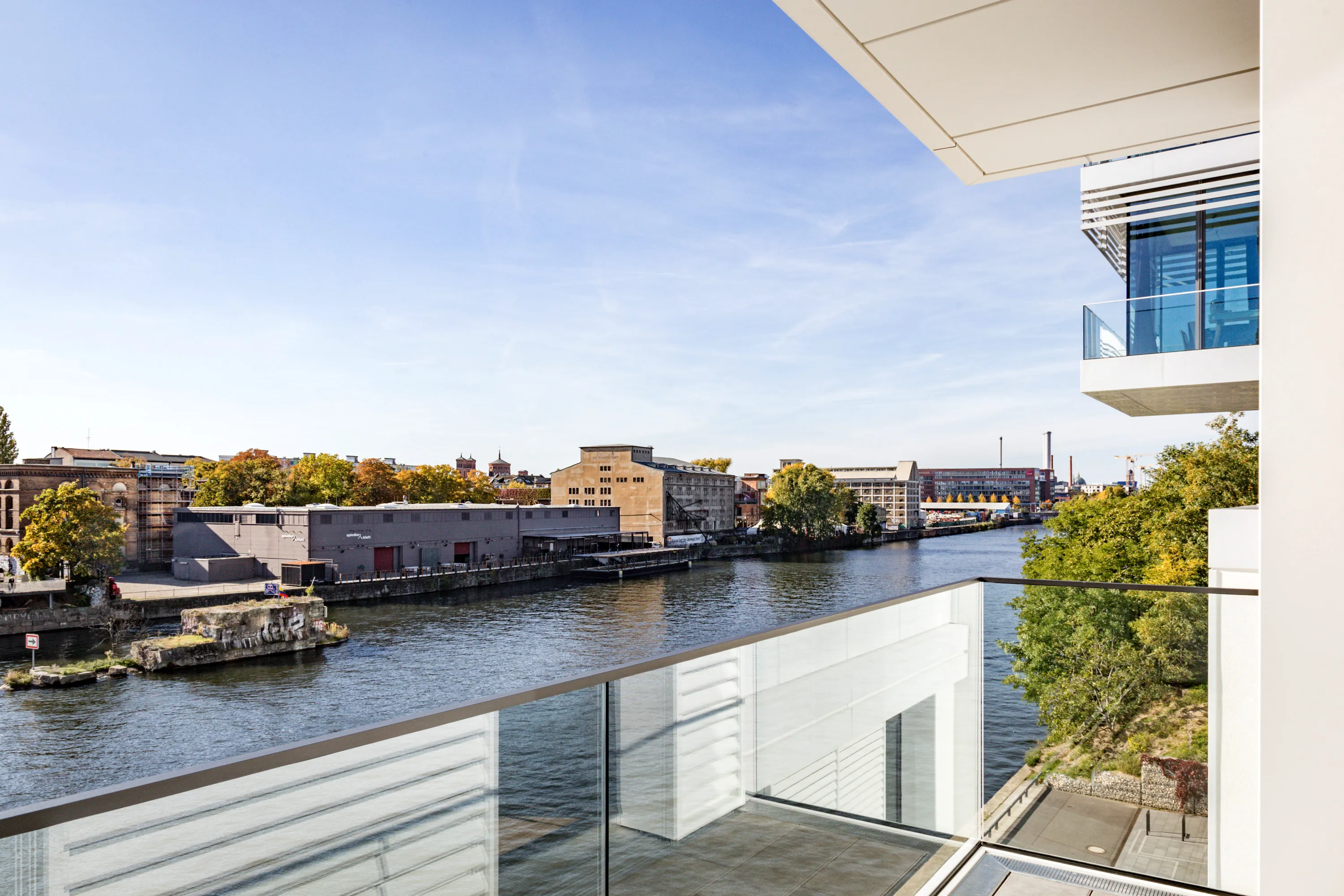 Bei dem 9-geschössigen Gebäude, in dem sich Wohn- und Gewerbeflächen vereinen, sorgen 2.500 Meter Balustrade für grenzenlose Transparenz. Direkt an der Spree gelegen, bietet das Gebäude großartige Aussichten. Umsetzung durch Metallbau Möller.