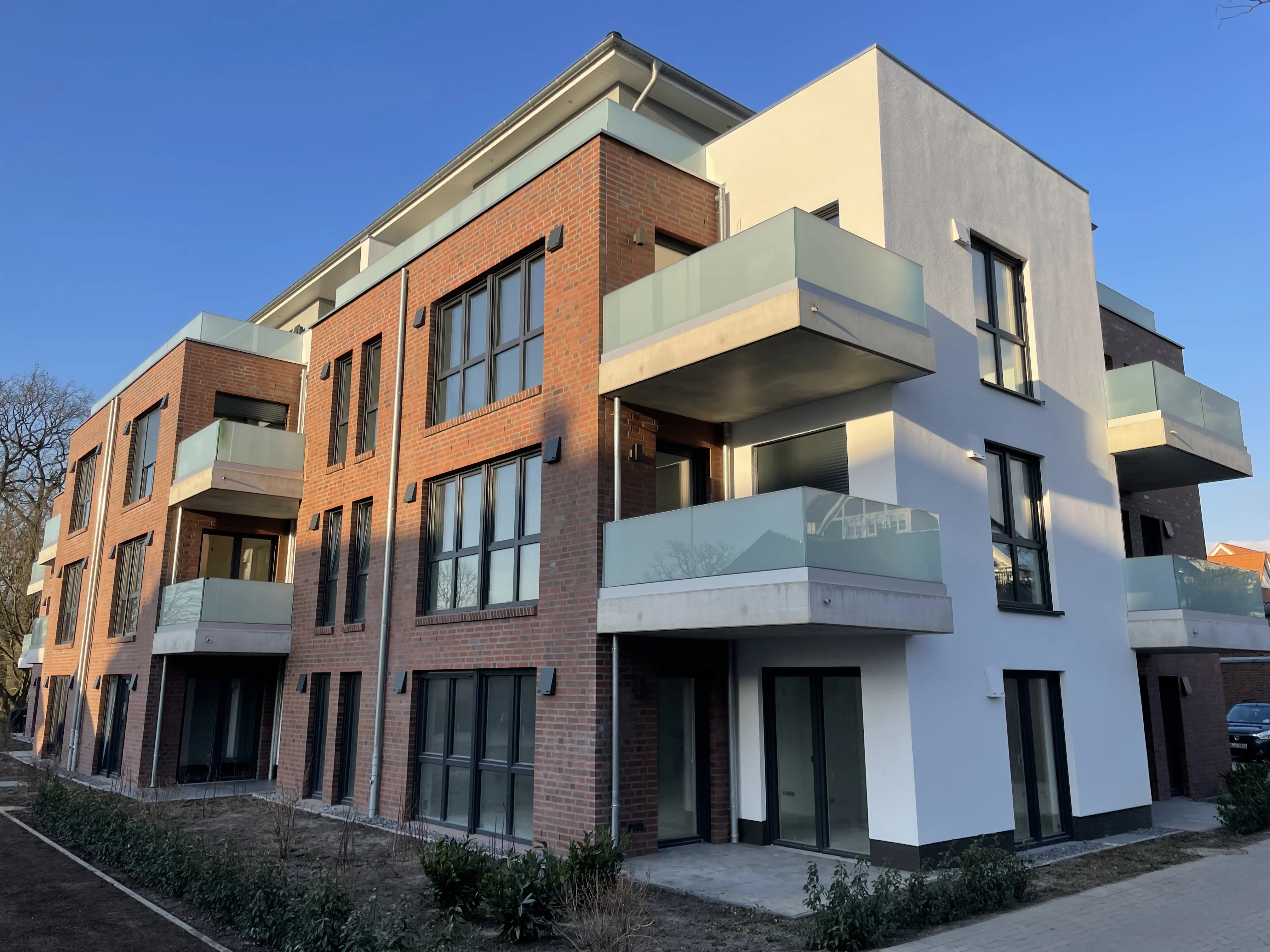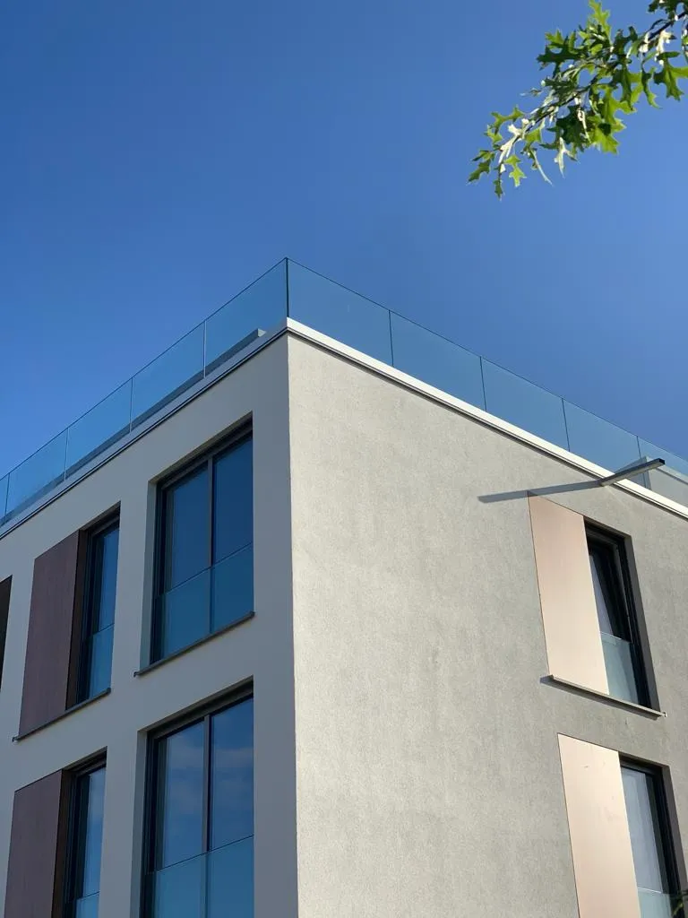 Wohnbauprojekt in Tostedt vom Bohle Partner Glas Hintelmann. Verbauung von über 155 Metern VetroMount® Ganzglasgeländer mit U- und F Profilen. Befestigung auf einer Attika im obersten Geschoss. Bohle unterstützte u. a. bei der Berechnung der Objektstatik.