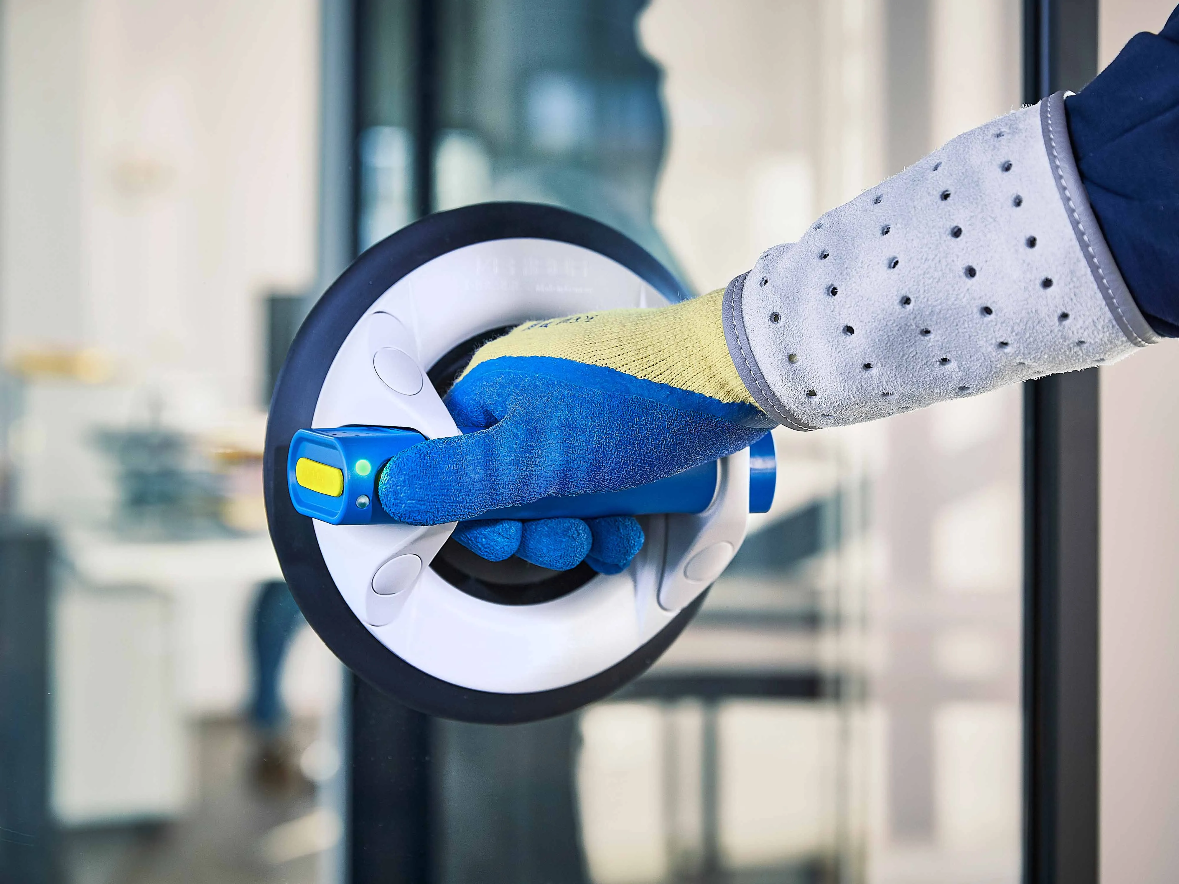Glastransport leicht gemacht: Beim elektrischen Veribor® Akkusaugheber passiert das Ansaugen auf Knopfdruck.
