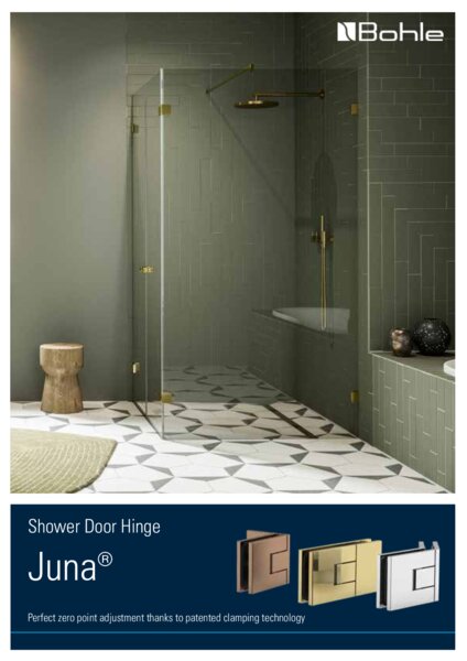 Developed and designed by Bohle, the Juna shower door hinge combines aesthetics and functionality with quality and “Made in Germany” workmanship. Minimum gap dimensions and concealed screws emphasize the supreme quality of this swinging door hinge. In addition, the material Juna is made of also reveals the high quality of the system.