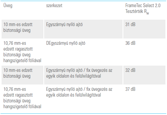 A zaj elleni védelem egyre fontosabbá válik a helyiségek tervezésénél. A FrameTec Select 2.0 üveg válaszfalrendszer lehetővé teszi az egyes helyiségek hangszigetelés szempontjából történő elkülönítését, miközben megőrzi a helyiség nyitott és világos érzetét. Az ift Rosenheim-i vizsgálóintézet hivatalos hangszigetelési vizsgálata 37 dB-es hangszigetelést tanúsít a rendszernek. A válaszfalrendszer ezért egyaránt alkalmas magán-, kórházi és irodai helyiségekbe.