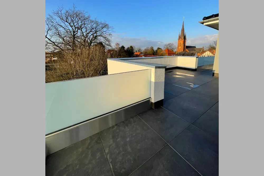Residential building project in Tostedt by Bohle partner Glas Hintelmann. Installation of over 155 metres of VetroMount® all-glass railings with U and F profiles. Attached to a parapet on the top floor. Among other things, Bohle provided support in the calculation of the building statics.
