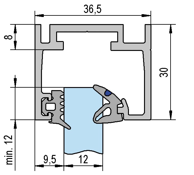 In 5000mm Länge für ESG und VSG (aus 2x ESG) 8-13,52mm, Profiltiefe 36,5 mm Falztiefe 31,5mm, Block- und Blendrahmen Konstruktionsprinzip zum Einbau in fertige Wandöffnungen im Innenbereich.