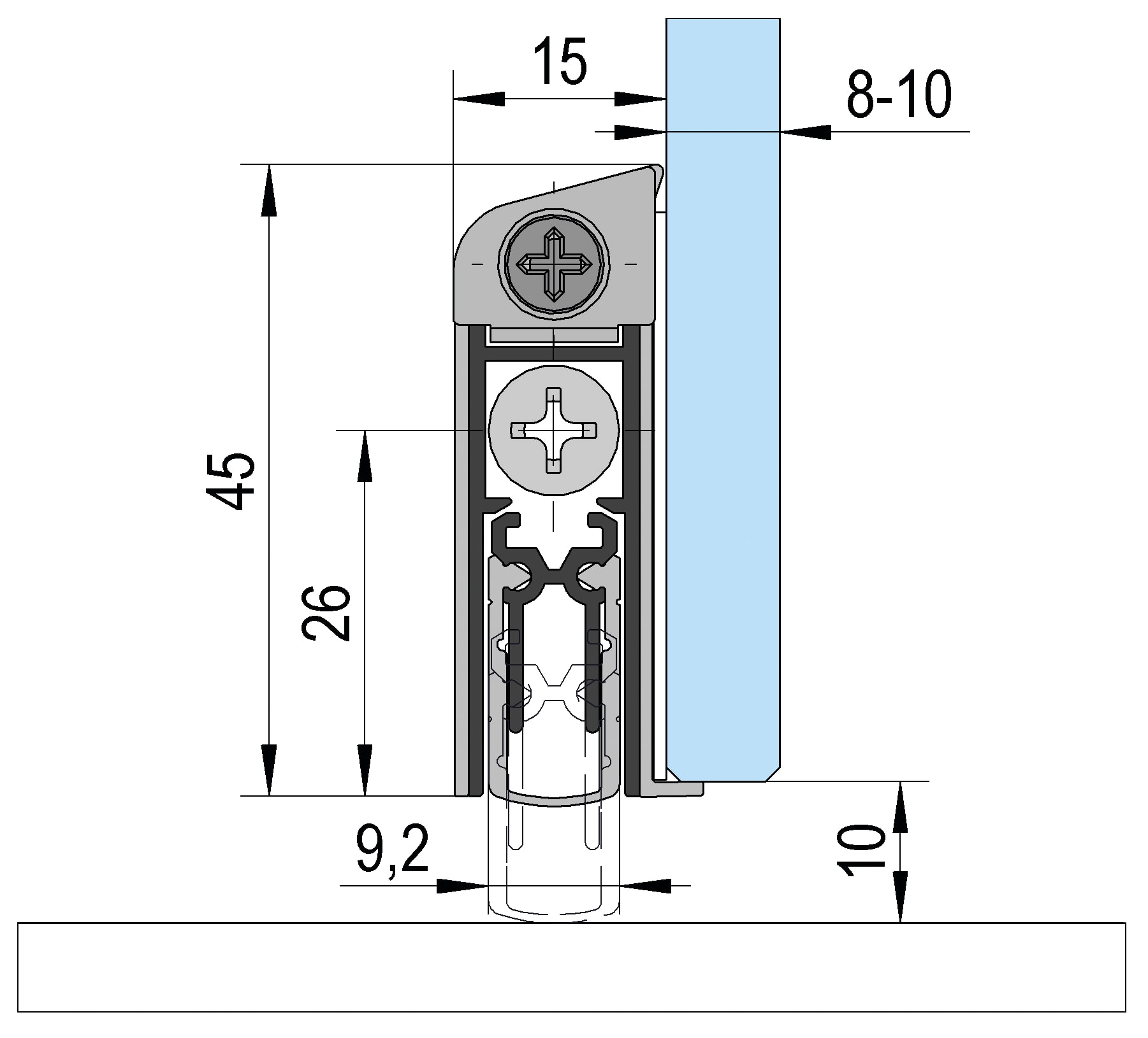 Die Gummilippe sollte auf das Zargenfalzmaß gekürzt werden und im abgesenkten Zustand vollständig an einer flachen, glatten Oberfläche anliegen. Der Abstand zwischen der unteren Glaskante und dem Boden beträgt 10 mm.