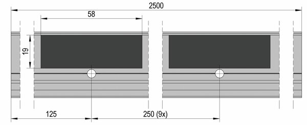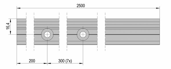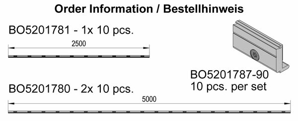 Zur Wandbefestigung sind die Profile im Abstand von 250 mm mit einem Ø von 6,4 mm vorgebohrt. Für 5000 mm Grundprofil werden 2 Klemmbackensets und 2 Abdeckprofile (5000 mm) benötigt. Für 2500 mm Grundprofil wird 1 Klemmbackenset und 1 Abdeckprofil (5000 mm) benötigt.