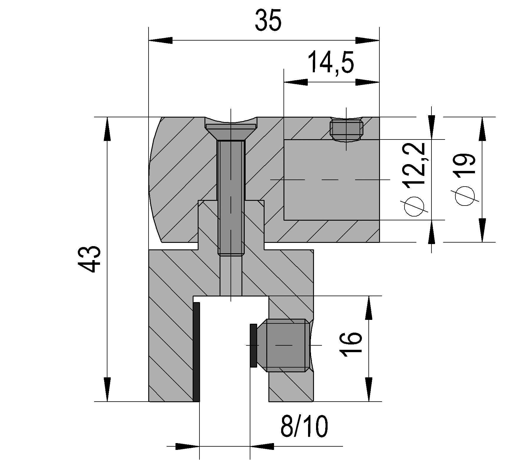 Glasanschluss passend zur Stabilisierungsstange Round 12, dient zur Verbindung eines festen Glasseitenteils mit einer Stabilisationsstange. Dieser Glasanschluss wird auf die obere Glaskante geklemmt und ist im Winkel frei verstellbar.
