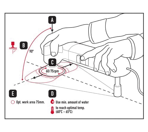 Die Polierscheibe Scratch Away® entfernt Kratzer auf allen Glastypen in einem einzigen Vorgang. Effizient und effektiv Mit der Glas-Polierscheibe Scratch Away® reicht schon ein geringer Druck beim Polieren in einer horizontalen und vertikalen Position (bei installiertem Fenster). Durch die handliche Größe, die niedrige Drehzahl und das spritzfreie Arbeiten verläuft das Polieren jetzt in jeder Werkstatt oder vor Ort effizient und effektiv. Außerdem sinkt dadurch die Gefahr, eine Glasscheibe zusätzlich zu beschädigen, was zu weiteren Verzögerungen bei der Lieferung führen könnte. Polierpaste spritzt aber Schaum nicht Der Polierschaum, der bei der richtigen Temperatur von 65° C/149° F aus der Polierscheibe kommt, bleibt an der jeweiligen Schadstelle. Der Schaum spritzt also durch die Drehbewegung und sein Eigengewicht nicht – wie bei herkömmlicher Polierpaste – herum. Die Härte ist kristallklar Da Glas ein besonders hartes Material ist, spielt der Druck, den ein Benutzer am Poliergerät aufbringen muss, eine ausschlaggebende Rolle. Für die Bearbeitung eines Materials wie Glas reicht somit ein Druck pro cm² aus; diesbezüglich ist der Durchmesser einer Polierscheibe ausschlaggebend. Je größer die Scheibe, desto mehr Druck muss ein Benutzer beim Polieren eines Kratzers aufbringen für den gleichen Druck pro cm². Mit der Scratch Away® Glas-Polierscheibe können +/- 23 Kratzer mit einer Länge von 50 mm entfernt werden. Die bevorzugte Geschwindigkeit der Maschine zum Polieren des Glases beträgt 3,8 fast 4. Die Endgeschwindigkeit, mit der sich das Glas-Polierscheibe auf dem Glas dreht, sollte +/- 65 U / min betragen, um eine Temperatur im Glas von 65° C/149° F zu erreichen. Sie können dies erreichen, indem Sie ungefähr 2,5 bis 3 Kilo Druck auf die Oberseite der Maschine ausüben und eine kleine Menge Wasser sprühen.