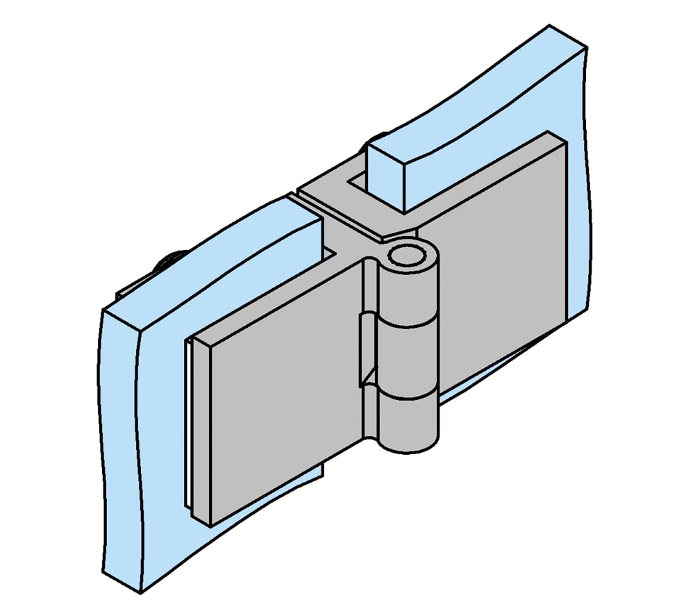 Vitreasy Möbelbänder Glas-Glas zur einfachen Befestigung von Glastüren an Glasseitenteilen beispielsweise von Ganzglasvitrinen. Erhältlich in verschiedenen Größen sowie mit und ohne Glasbearbeitung.