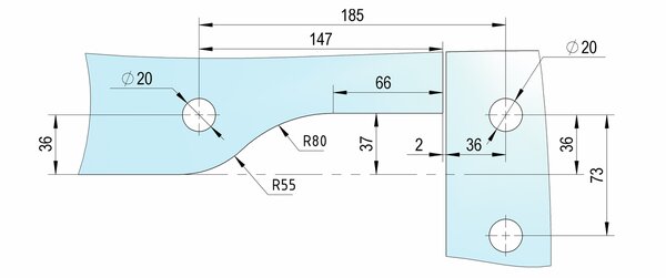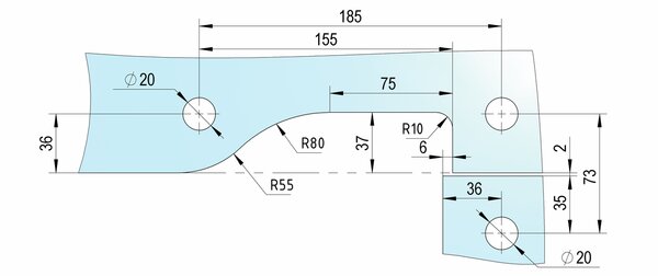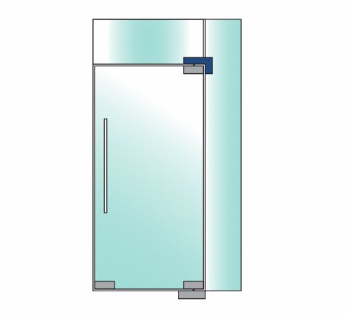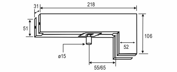 Winkel-Oberlichtbeschlag PT 40 mit einem Bolzen Ø 15 mm verbindet Seitenteil, Oberlicht und Tür in einer Ganzglasanlage. Der Drehpunkt kann auf 55 oder 65 mm eingestellt werden.