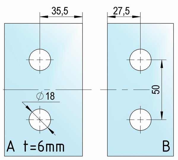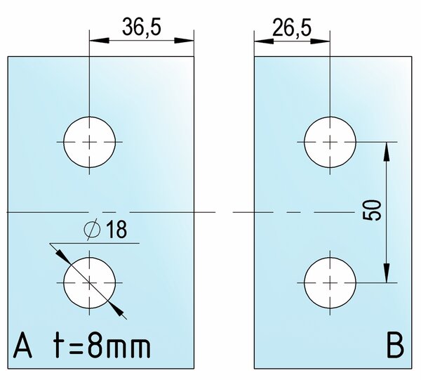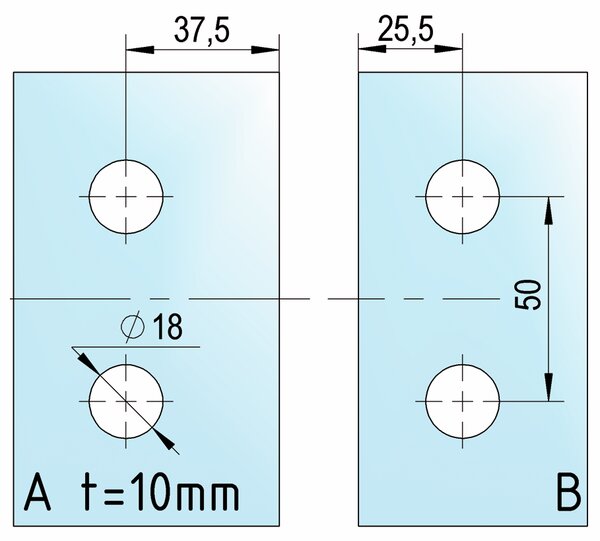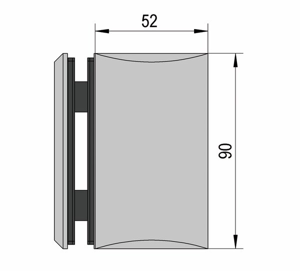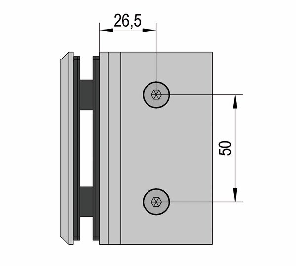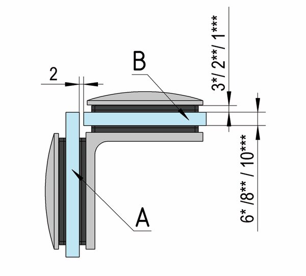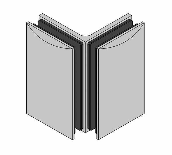 Art Winkelverbinder 90° Glas-Glas zum Verbinden zweier feststehender Glasseitenteile. Hierbei sind lediglich Glasbohrungen in den Glasscheiben erforderlich.