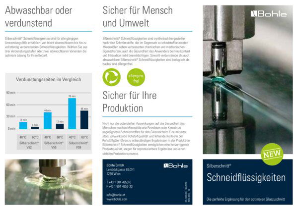 Silberschnitt® Schneidflüssigkeiten sind wasserlöslich, umweltfreundlich und für alle gängigen Anwendungsfälle erhältlich: von garantiert rückstandslos abwaschbaren bis hin zu zuverlässig restlos verdunstenden Schneidflüssigkeiten, die je nach Bedarf in drei Verdunstungsstufen zur Wahl stehen. Schneidflüssigkeiten schmieren das Schneidrädchen, minimieren die Reibung und ermöglichen somit längere Standzeiten. Eine Reduzierung des Schneiddrucks resultiert in geringerer Beschädigung der Glasoberfläche, was zu weniger Abplatzungen und besserer Kantenqualität führt. Zudem werden feinste Glaspartikel gebunden und Folgeschäden in nachgelagerten Prozessschritten werden vermieden.