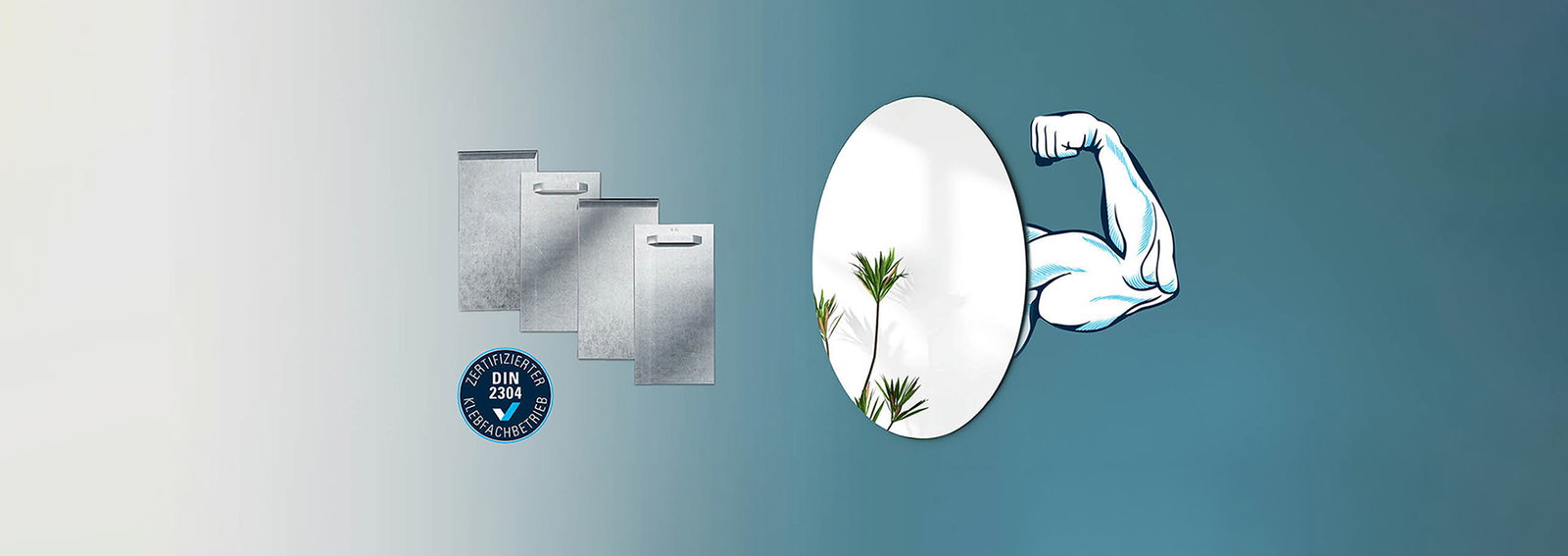 Reinigen Sie zunächst die Stellen, auf denen die Haftbleche zum Einsatz kommen. Hierfür eignen sich am besten Reiniger mit Isopropanol, wie der Bohle Spezialreiniger. Entfernen Sie die Schutzfolie von den Spiegelblechen. Die Bleche werden mit 10 cm Abstand vom Spiegelrand auf die Rückseite des Spiegels geklebt. Bohren Sie passend dazu die Bohrlöcher in der Wand. Die Spiegelaufhängung sollte sich im oberen Drittel des Spiegels befinden. Kleben Sie das Spiegelblech an den Spiegel, sorgen Sie dafür, dass keine Lufteinschlüsse im Klebstoff entstehen und drücken Sie die Bleche für mind. 10 Sekunden gleichmäßig fest an. Nach 30 Minuten tritt die erste Haftwirkung des Klebstoffs ein. Wir empfehlen weitere 24 Stunden Wartezeit bei Raumtemperatur, um eine vollständige Aushärtung des Klebstoffes zu gewährleisten. Bei großen Spiegeln sorgen Magnete für einen fixen Wandabstand und vermeiden so gefährliches Kippeln.