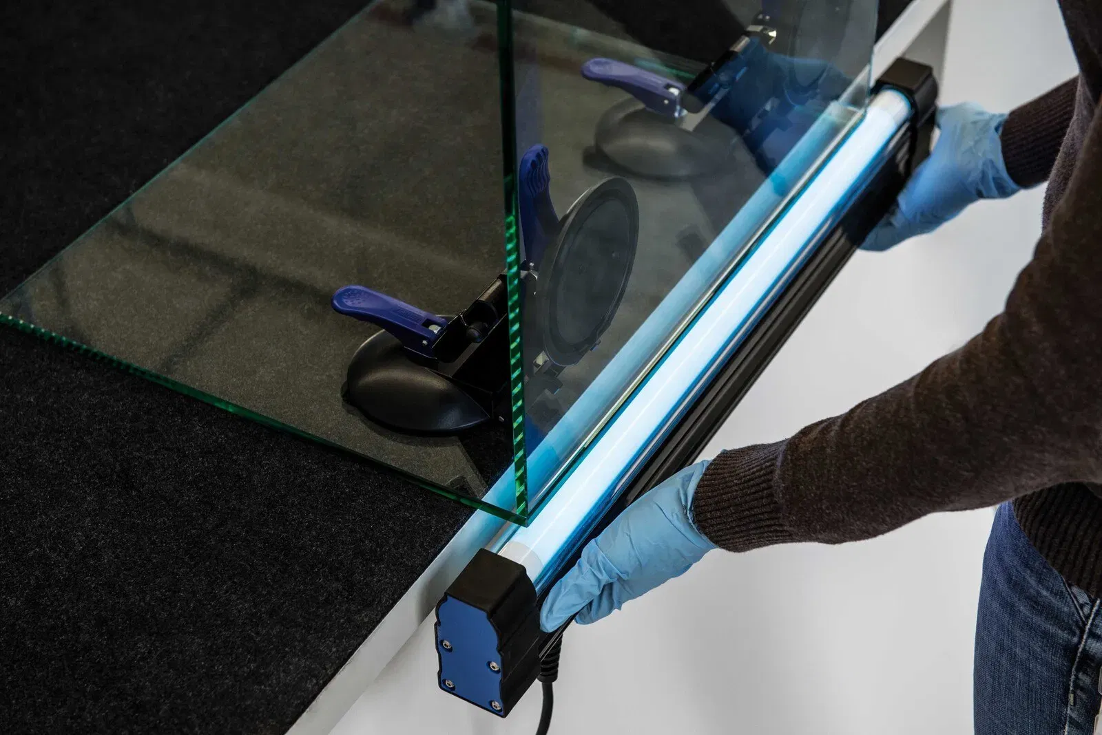 Längst hat der Werkstoff Glas auch die Bereiche Interior und Ladenbau erobert. Ein immer wichtigerer Zweig der modernen Glasverarbeitung ist das Verkleben von Glasflächen – mit sehr hohen ästhetischen Ansprüchen. Die Technik des UV-Klebens hat sich dafür bestens bewährt.