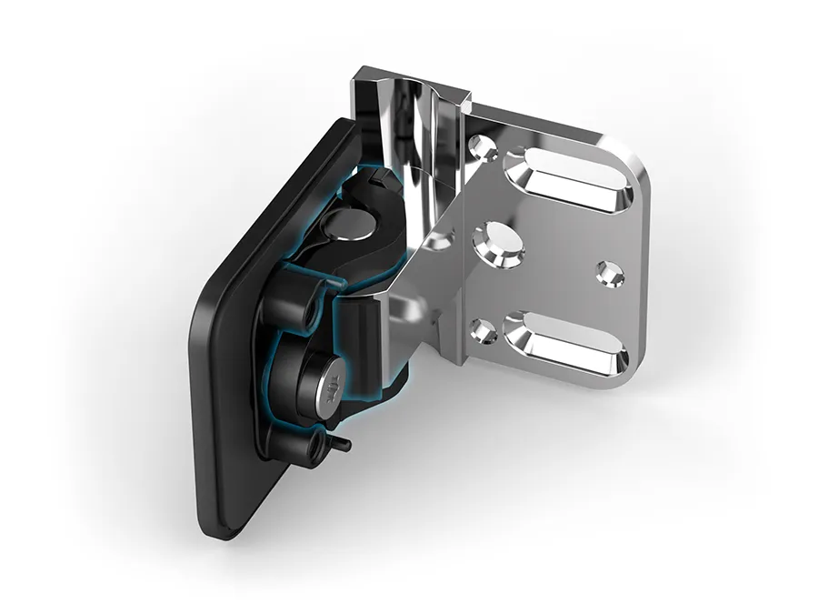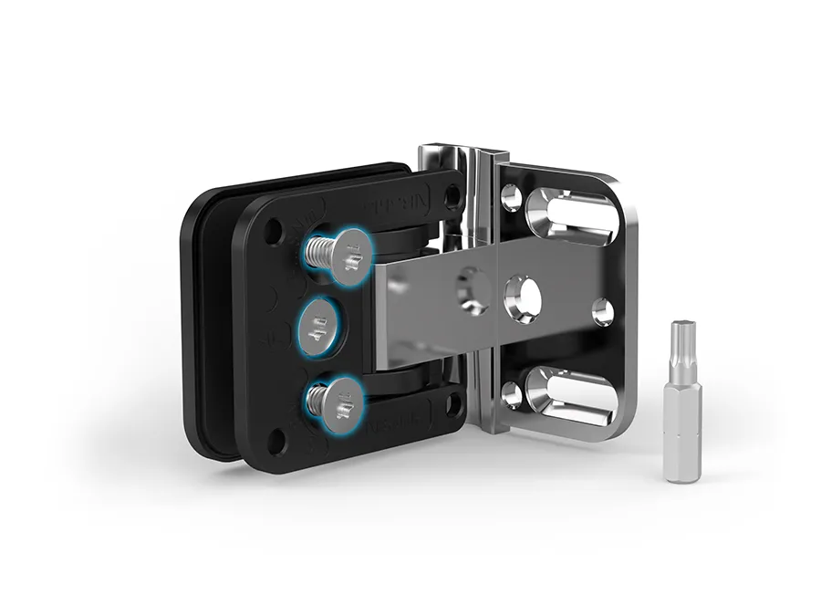 Juna simplifies the installation of shower door hinges many times over. It starts with the patented adjustment of the zero position: The zero position screw is centrally located in the hinge and is therefore easy to reach. The adjustment is made using a revolutionary tensioning technique that does not create any disturbing notches on the hinge axis. This makes it possible, for example, to readjust the belt precisely. The second distinguishing feature of Juna relates to the cover caps. They are placed on the belt with the help of four centring pins including water-resistant rubber rings and thus sit particularly precisely and firmly. With a simple pulling movement, the caps can also be removed again, if desired.