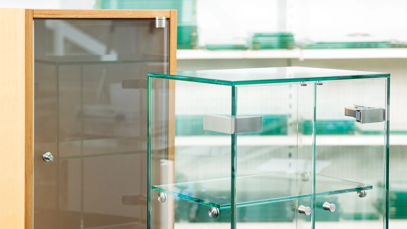 - Glass display cabinets and tables