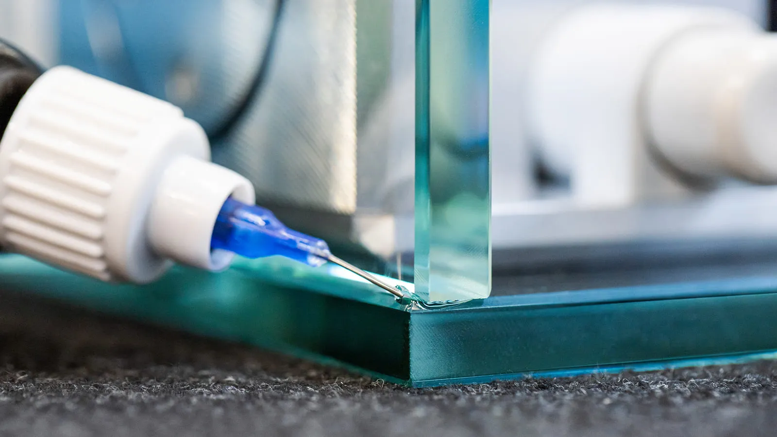 We have developed various adhesives for glazier applications. The choice of the right adhesive for your project depends on the material combination, the environmental conditions and the expected future loads on the finished construction. In addition to low-viscosity, capillary adhesives, we also have medium-viscosity, impact-resistant or elastic adhesives in our range. If moisture or UV radiation are to be expected, correspondingly resistant adhesive types must be used. Once you have selected the appropriate capillary UV adhesive, insert the dosing needle of the bottle directly into the seam between the two glass elements and wih the help of the needle apply the adhesive over the entire length of the joint.