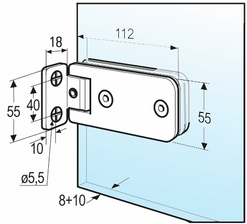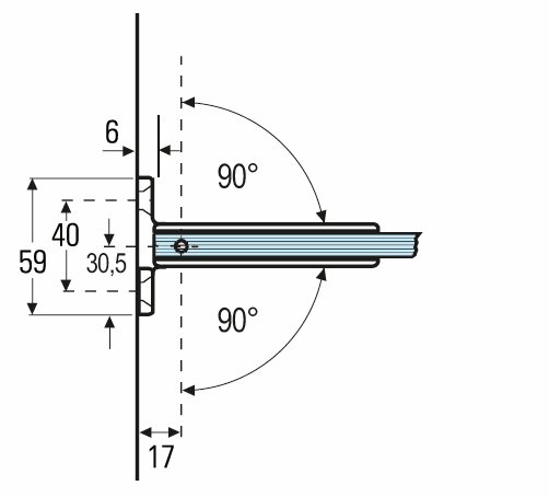 La bisagra Granada para puertas de ducha de batientes a 90° en vidrio-pared tiene una capacidad de carga de 35 kg. Para puertas de hasta 0,9 x 2 m. El montaje a 90° en vidrio-pared con conexión a la pared por ambos lados permite montar una puerta de vidrio en una pared