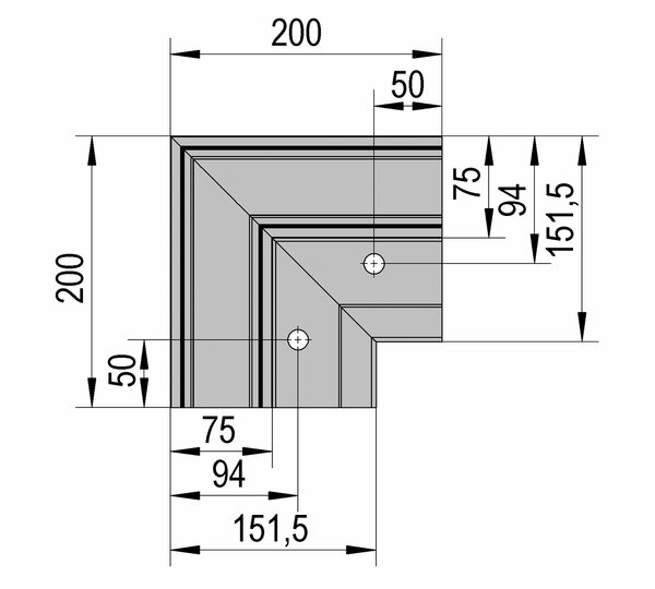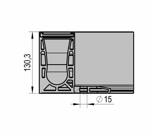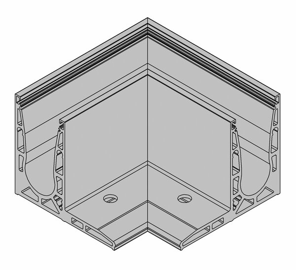 La esquina prefabricada para el perfil de suelo VetroMount® F permite una precisa unión angular a 90° del perfil básico, sin necesidad de realizar cortes a inglete. La pieza esquinera puede conectarse fácilmente a las secciones de perfil adyacentes con ayuda de los pasadores de conexión VetroMount®.