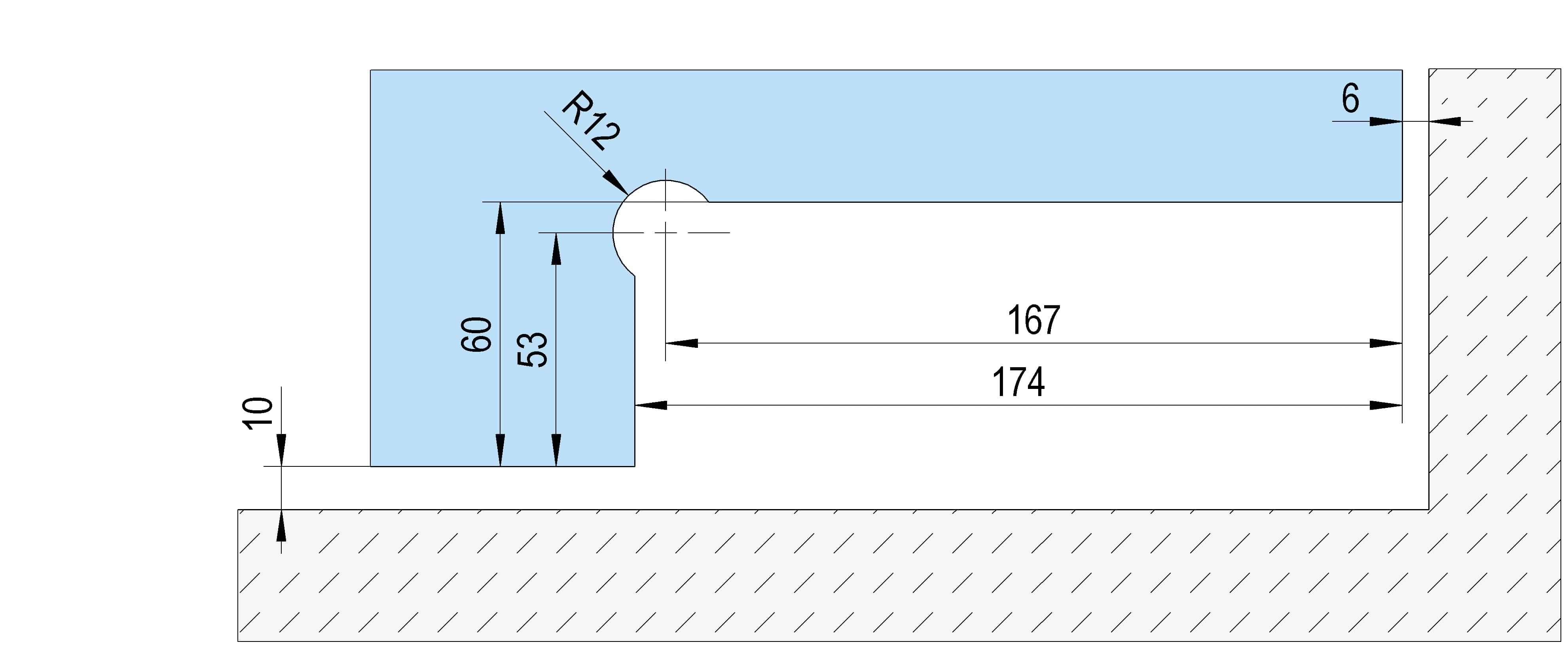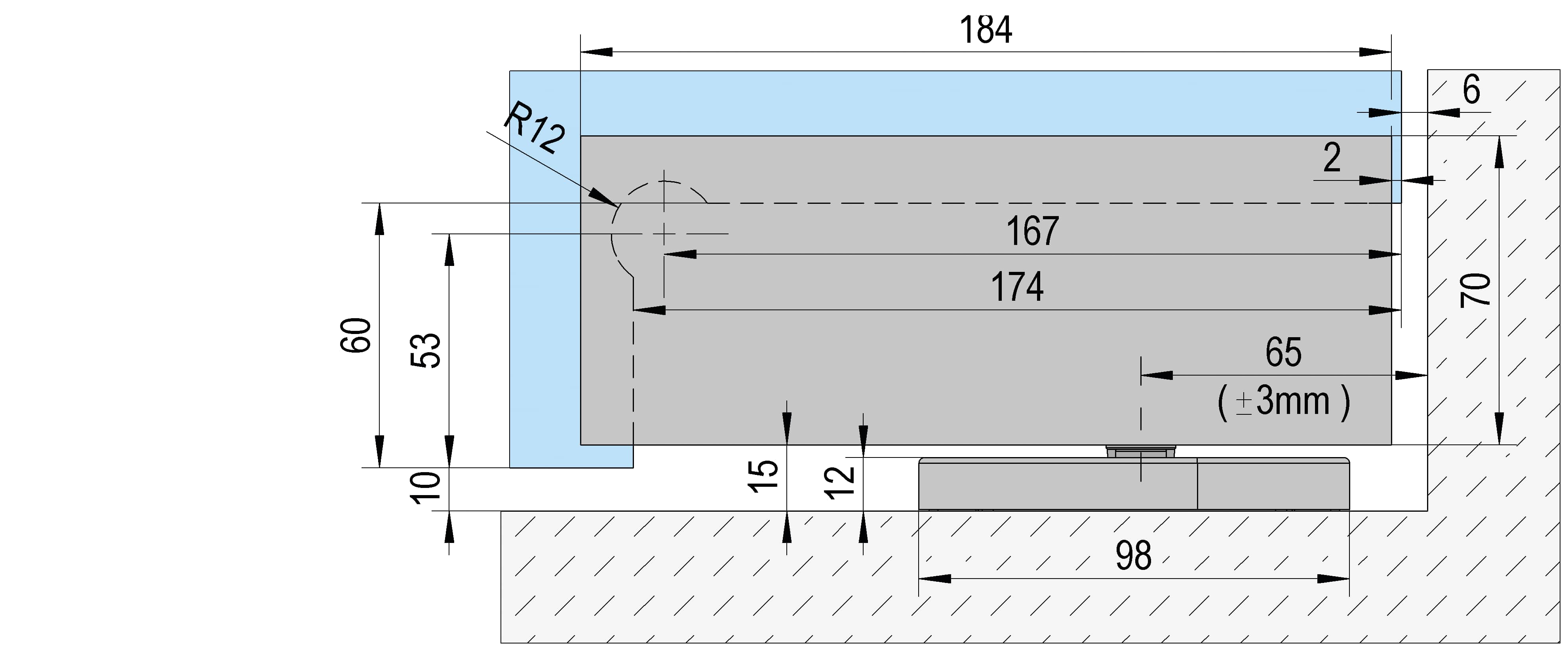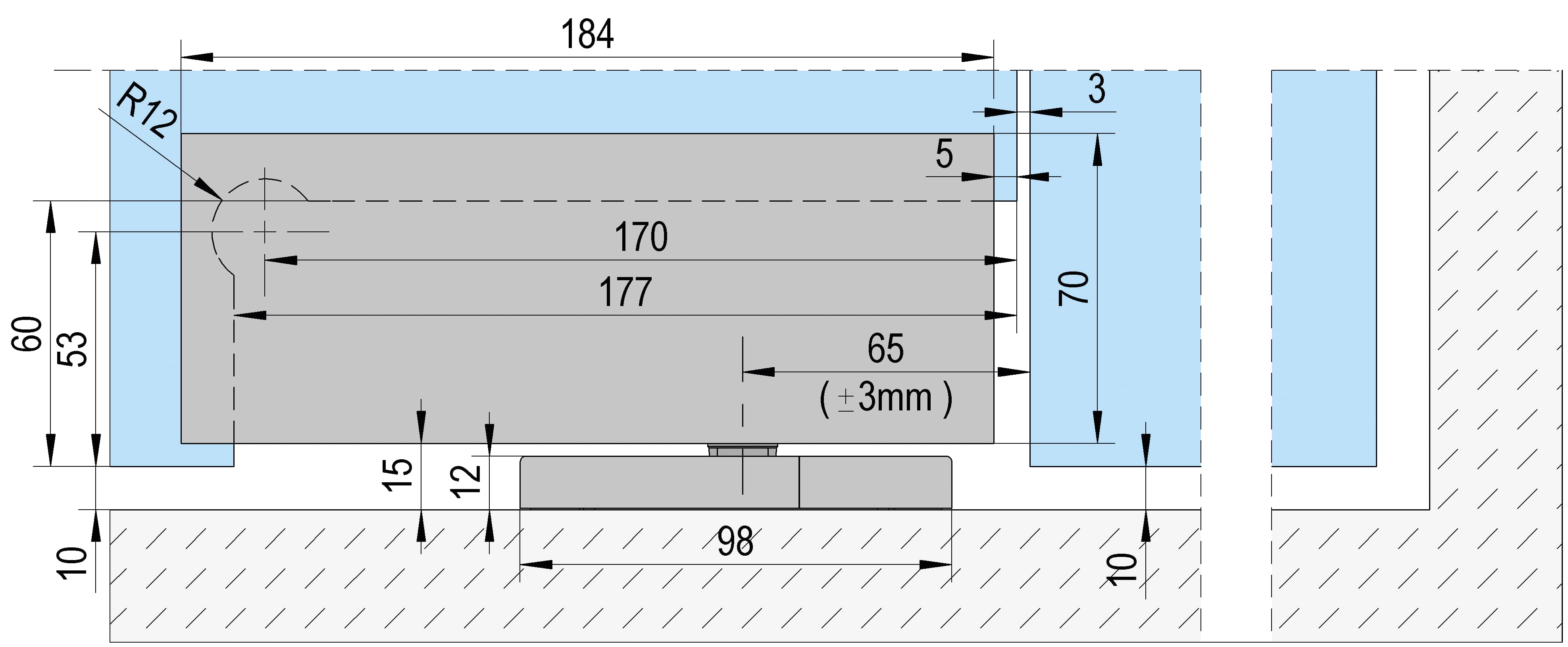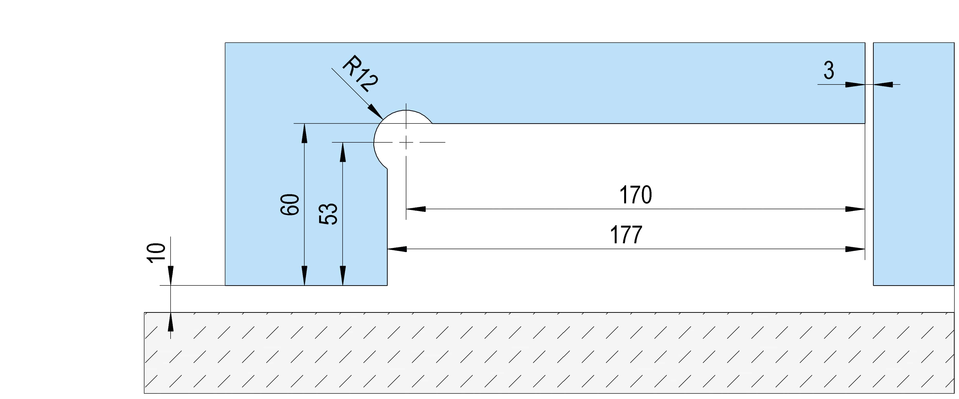 El herraje de esquinas con cierre automático Alva permite una rápida instalación sin necesidad de un laborioso rebaje en el suelo. Todo el sistema hidráulico para la función de autocierre está alojado en el propio herraje. Mediante una placa base, el herraje se fija al suelo con sólo dos tornillos.