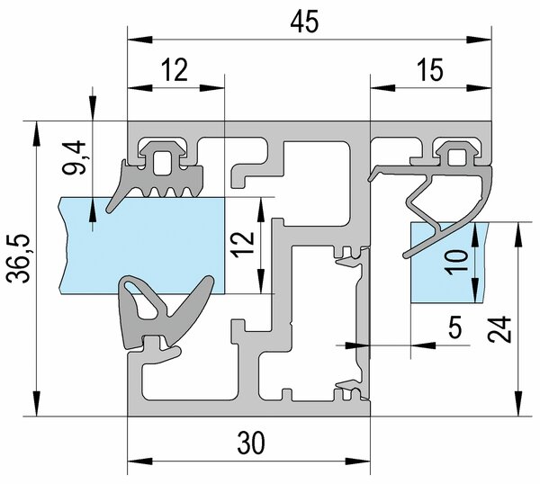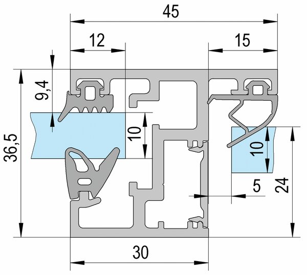 Los perfiles del marco se pueden utilizar tanto para soluciones vidrio-pared como vidrio-vidrio. Como no es necesario fresar las bisagras de la puerta ni la chapa de cierre, la hoja de la puerta puede montarse DIN derecha y DIN izquierda. Basta con deslizar los soportes de las bisagras en el canal multifunción y, a continuación, fijar las bisagras con tornillos. Los robustos conectores de las esquinas garantizan una sujeción segura de los ingletes.