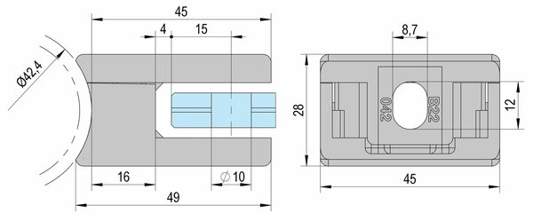 Con solo cuatro fijaciones de sujeción por cristal, se pueden alcanzar luces de hasta dos metros y espesores de cristal de entre 6 y 10,76 mm. Las inserciones de goma, disponibles por separado, ofrecen posibilidades de combinación flexibles entre la fijación con abrazadera y el vidrio. Gracias a las diferentes conexiones de tubo, las fijaciones con abrazadera Bohle pueden montarse en todos los postes de barandilla habituales (tubo cuadrado, tubo redondo de Ø 42,4 mm y tubo redondo de Ø 48,3 mm) tanto en interiores como en exteriores.