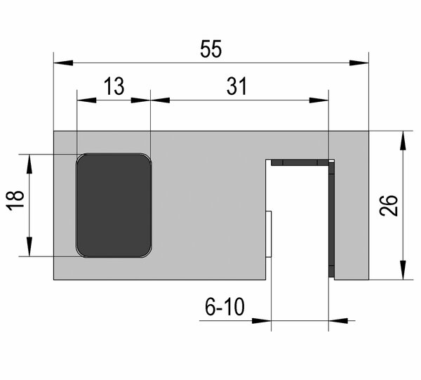 La adaptación a distintos grosores de vidrio no se consigue en este caso mediante topes de distinto grosor, sino modificando la posición de montaje en el panel lateral.