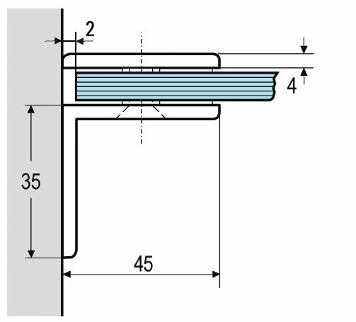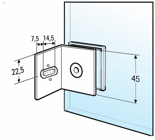 Unión angular Granada a 90° en vidrio-pared para conectar un panel lateral de vidrio fijo a una pared.