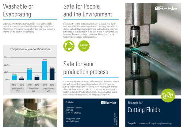 Los modernos fluidos de corte sintéticos son definitivamente preferibles a los agentes de corte tradicionales, como el petróleo o la parafina. Los fluidos de corte lubrican la rueda de corte, minimizando la fricción y permitiendo así una mayor vida útil de la herramienta. Las mayores ventajas: un buen efecto lubricante, una rotura audiblemente más suave y una calidad de los bordes notablemente mejorada. Además, los líquidos de corte modernos aglutinan el polvo de vidrio y reducen considerablemente la formación de aglomeraciones de fragmentos de vidrio.