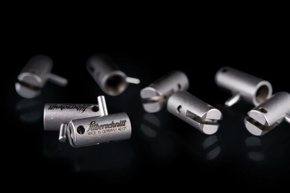 Los portarulinas de acero Silberschnitt® se adaptan con precisión a los requisitos de las máquinas de corte modernas. En primer plano está su rápida intercambiabilidad y alta precisión. Los portarulinas de acero se fabrican en máquinas controladas por CNC. Esto garantiza que las ranuras para alojar las rulinas de corte y los taladros de los ejes se realicen exactamente en ángulo recto. Las tolerancias mínimas garantizan que las rulinas funcionen con precisión.