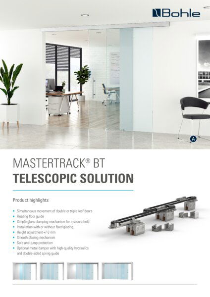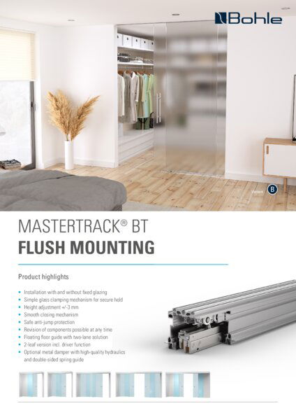 With MasterTrack® FT, Bohle offers a high-tech complete solution for sliding door systems that impresses with revolutionary running gear and noticeable smoothness. The special feature: The entire assembly requires only a few hand movements. The installation is therefore quick, intuitive and cost-saving.