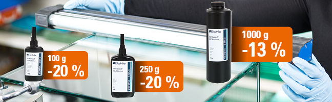 Al adquirir una de nuestras lámparas UVA-Star, los adhesivos correspondientes se ofrecen con un precio reducido exclusivo. Las versiones de 100 g y 250 g incluyen un descuento aproximado del 20 %, mientras que los envases de 1 kg ofrecen una reducción de alrededor del 13 %.