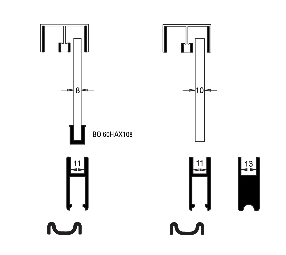 Pour le verre de 8 mm, il faut utiliser le profilé sabot BO 60HAX108