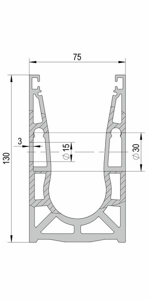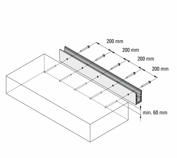 Le profil latéral U VetroMount® pour le montage en applique est en aluminium extrudé et se distingue par son aspect qualitatif. Pour fixer le profilé, il suffit de respecter un écart de 200 mm entre les vis. L'utilisation de vis à béton évite d'avoir à enfoncer des chevilles à expansion