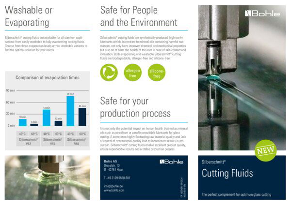 Los modernos fluidos de corte sintéticos son definitivamente preferibles a los agentes de corte tradicionales, como el petróleo o la parafina. Los fluidos de corte lubrican la rueda de corte, minimizando la fricción y permitiendo así una mayor vida útil de la herramienta. Las mayores ventajas: un buen efecto lubricante, una rotura audiblemente más suave y una calidad de los bordes notablemente mejorada. Además, los líquidos de corte modernos aglutinan el polvo de vidrio y reducen considerablemente la formación de aglomeraciones de fragmentos de vidrio.