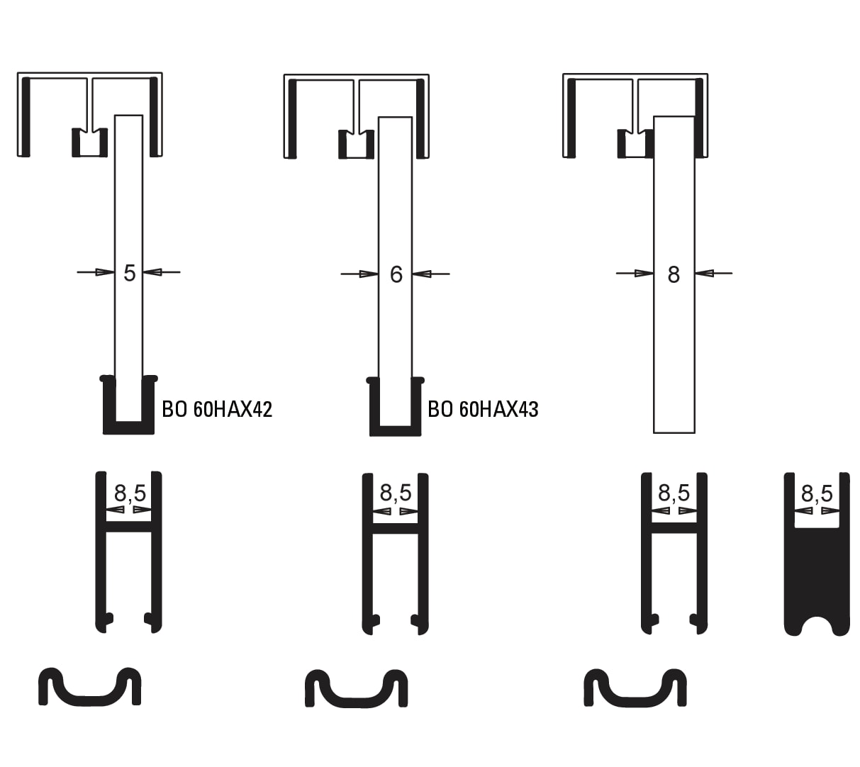 Pour le verre de 8 mm, le profilé sabot doit être collé directement. Pour le verre de 6 mm, le profié sabot BO 60HAX43 Pour le verre de 5 mm, le profilé sabot BO 60HAX42