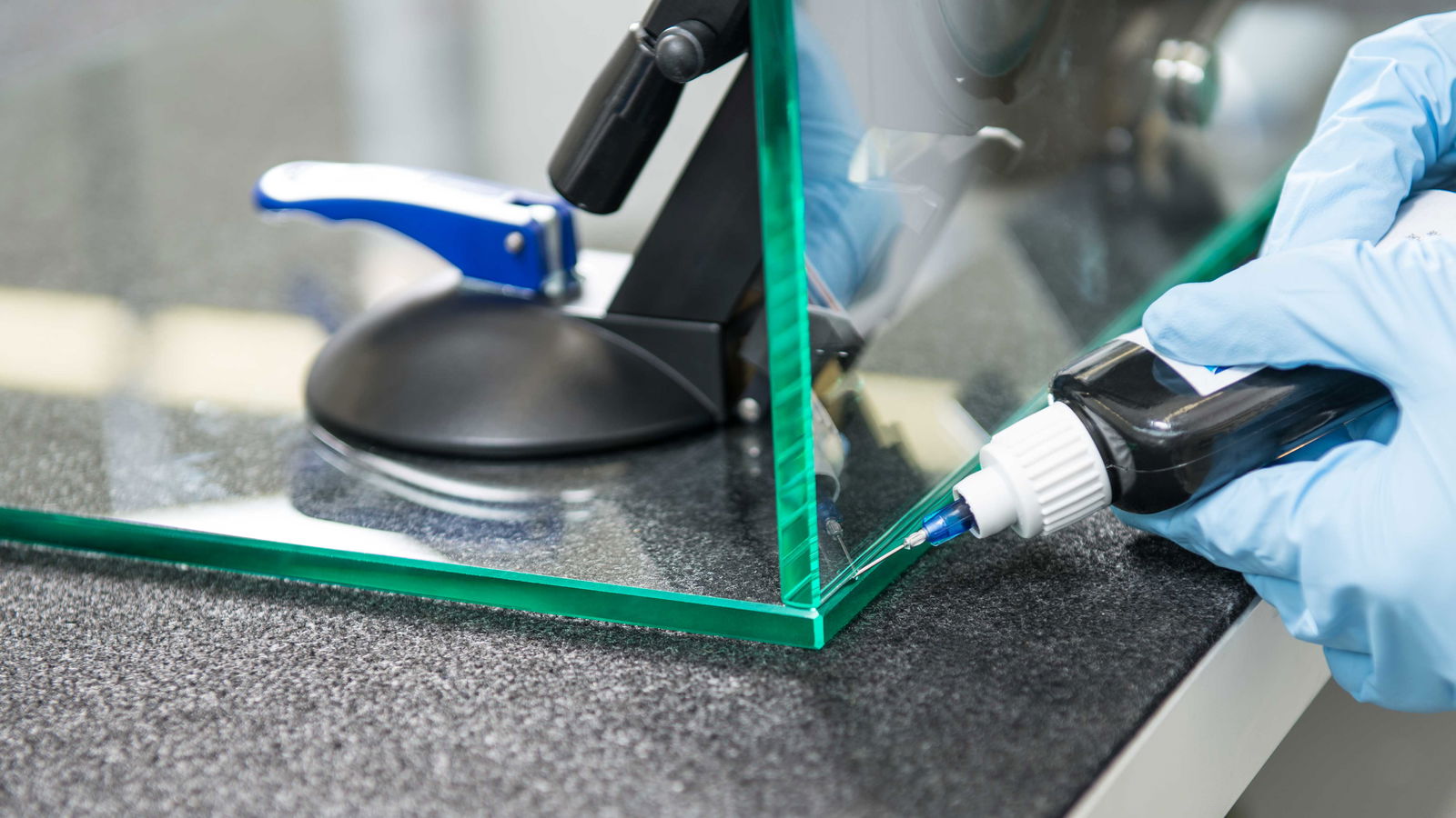 Nous avons développé différents types de colles pour les applications dans le domaine de la miroiterie. Le choix de la colle adaptée à votre projet résulte de la combinaison des matériaux, des conditions ambiantes et des futures contraintes attendues sur la construction finie. Outre les colles à faible viscosité, notre gamme comprend également des colles à viscosité moyenne, résistantes aux chocs ou élastiques. Si l'on s'attend à des contraintes dues à l'humidité ou aux rayons UV, il faut utiliser des types de colle résistants en conséquence. Une fois que vous avez choisi la colle UV appropriée (par capillarité), placez l'aiguille de dosage du flacon directement dans le joint entre les deux éléments en verre et appliquez la colle sur toute la longueur du joint à l'aide de l'aiguille.