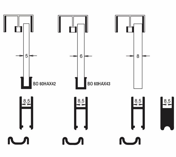 Per vetro da 8 mm, il profilo di scorrimento deve essere incollato direttamente Per vetro da 6 mm, il profilo di alloggiamento BO 60HAX43 Per il vetro da 5 mm, il profilo di alloggiamento BO 60HAX42