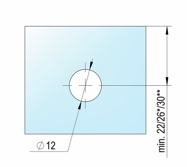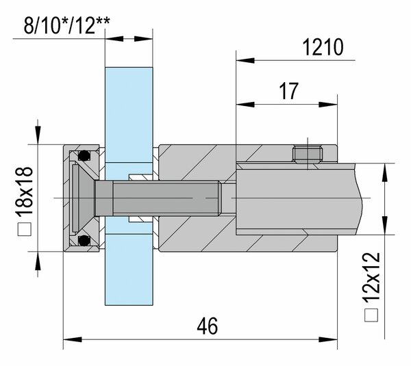 Raccordo per vetro adatto alla barra di rinforzo quadro 12, utilizzato per collegare un pannello laterale di vetro fisso a una barra di rinforzo. Questo raccordo per vetro non viene fissato al bordo del vetro come di consueto, ma richiede un foro di 12 mm nel pannello laterale del vetro.