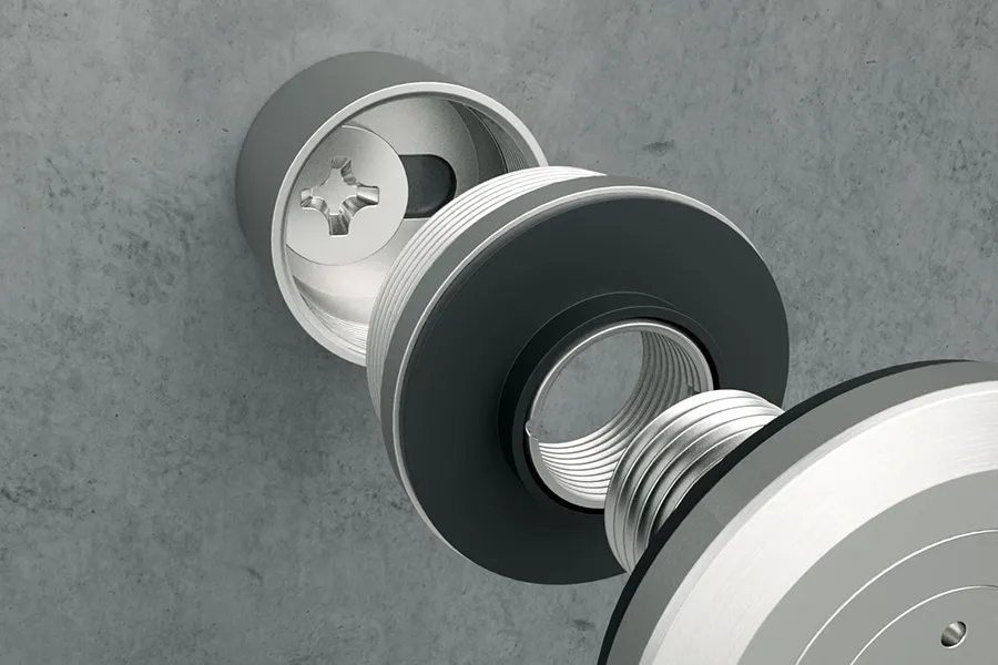 Un fondo stabile è essenziale per il montaggio sicuro dei punti di fissaggio. Da questo dipende il tipo di fissaggio necessario per il montaggio. Il corpo base viene fissato al fondo attraverso un foro asolato, che consente di compensare le imprecisioni durante la foratura. Quindi si posiziona la lastra di vetro e si avvita la piastra frontale al corpo di base attraverso un foro nel vetro.