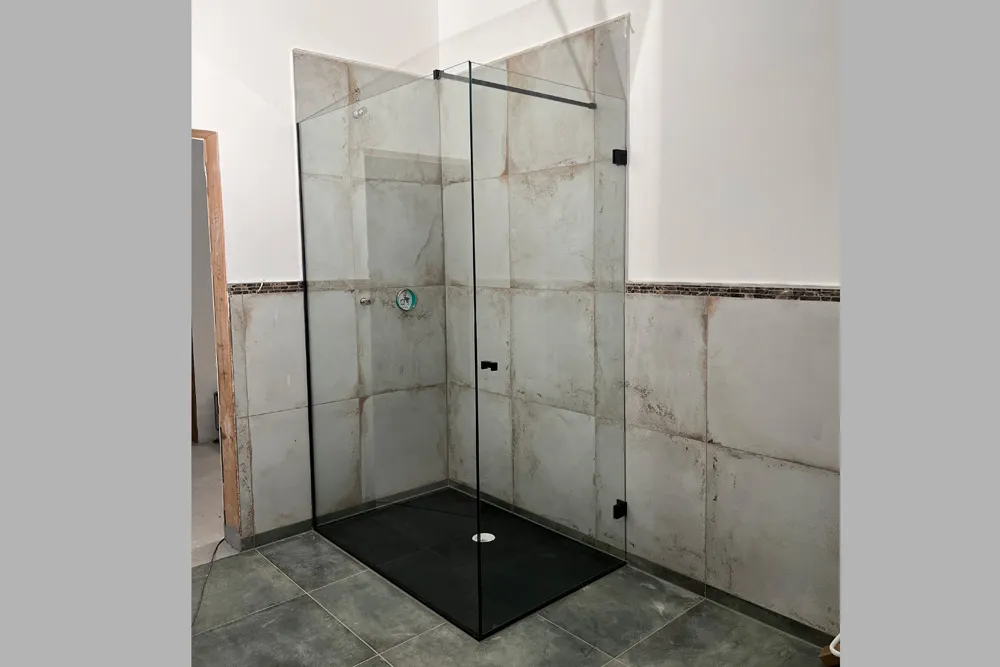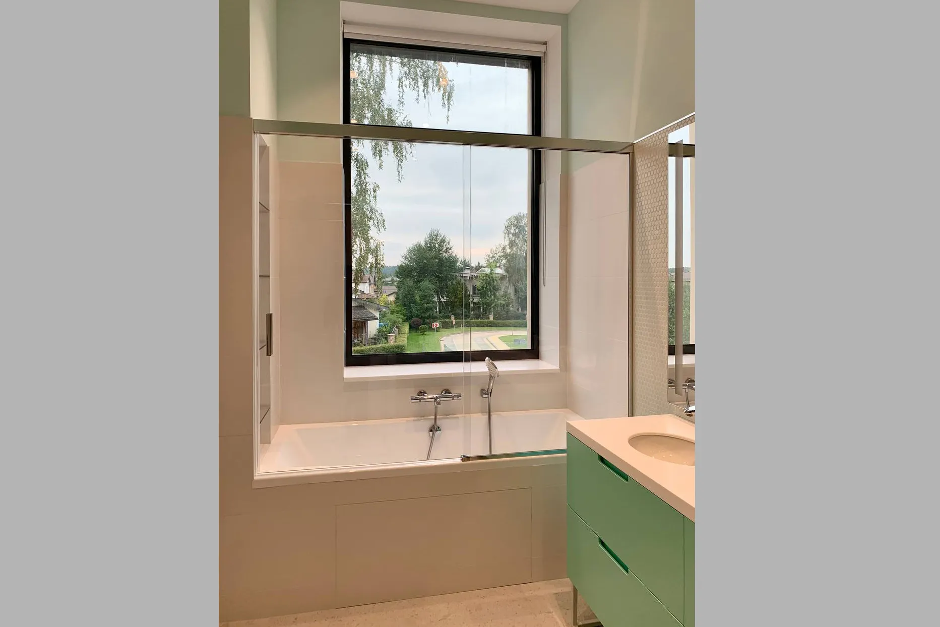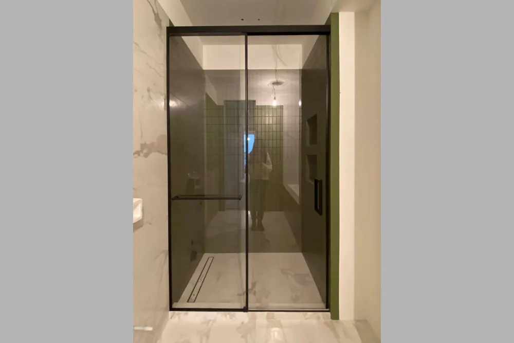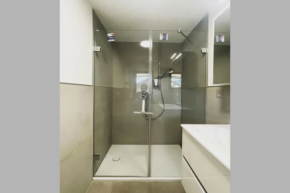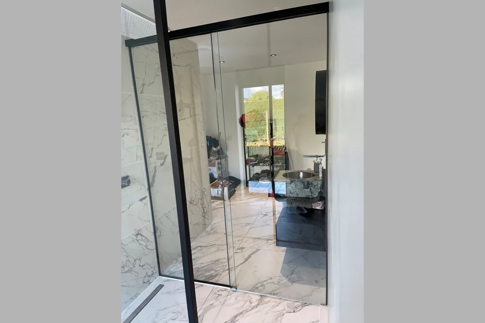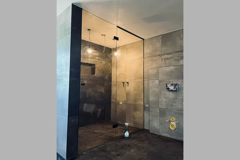 Che si tratti di una nicchia o di una doccia ad angolo: questa porta scorrevole convince per la sua lavorazione di alta qualità. Particolarmente richiesta la superficie anodizzata nera, come quella installata qui da Fermont Miroiterie e Teijlers Glas AB.
