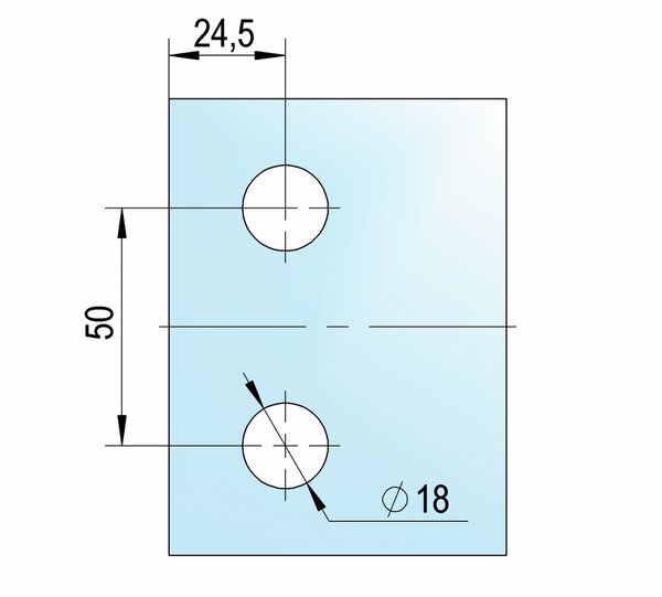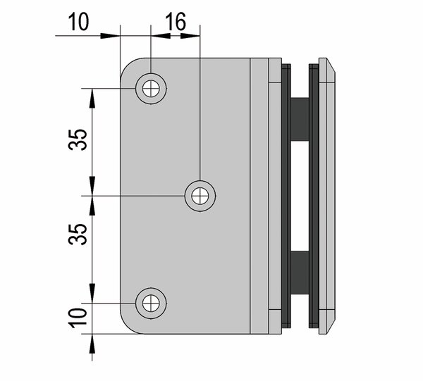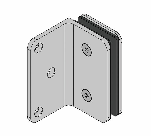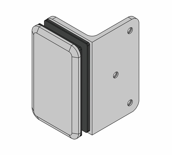 Barcelona angle connector 90° glass-wall for connecting a fixed glass side panel to a wall. Only simple glass holes in the glass panes are required.