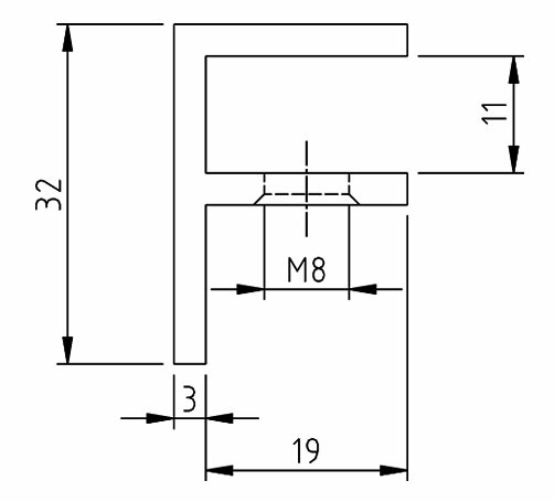 Glass shelf support made of brass profile in different sizes. The extension of the wall support downwards significantly increases stability. Individually adjustable clamping reliably prevents the glass shelves from slipping out. A plastic spacer is included in the delivery.