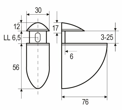 Beautifully rounded glass shelf supports made of die-cast zinc, available in different sizes and finishes. The generous, individually adjustable clamp securely prevents the glass shelves from slipping out and also allows wooden shelves to be held in place.
