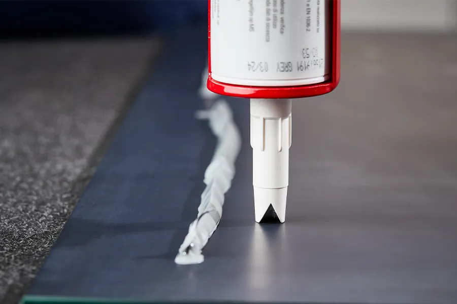 - Use a triangular nozzle for application. The triangular beads ensure better adhesive distribution when pressed onto the wall.
