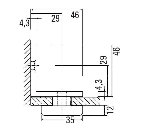 Angle connector 90° glass-wall for connecting a fixed glass side panel to a wall. Only simple glass drill holes are required in the glass panes.