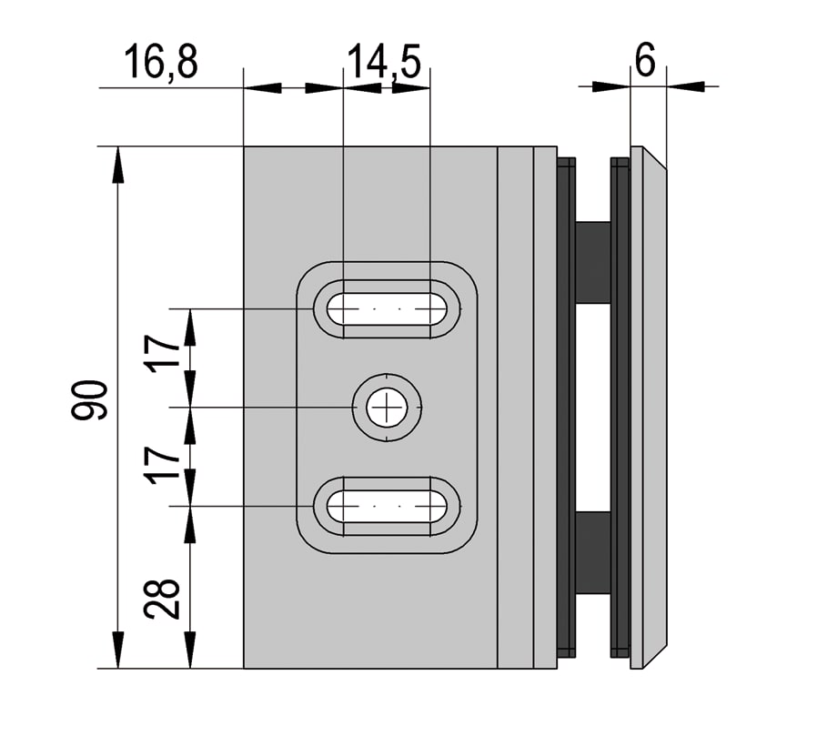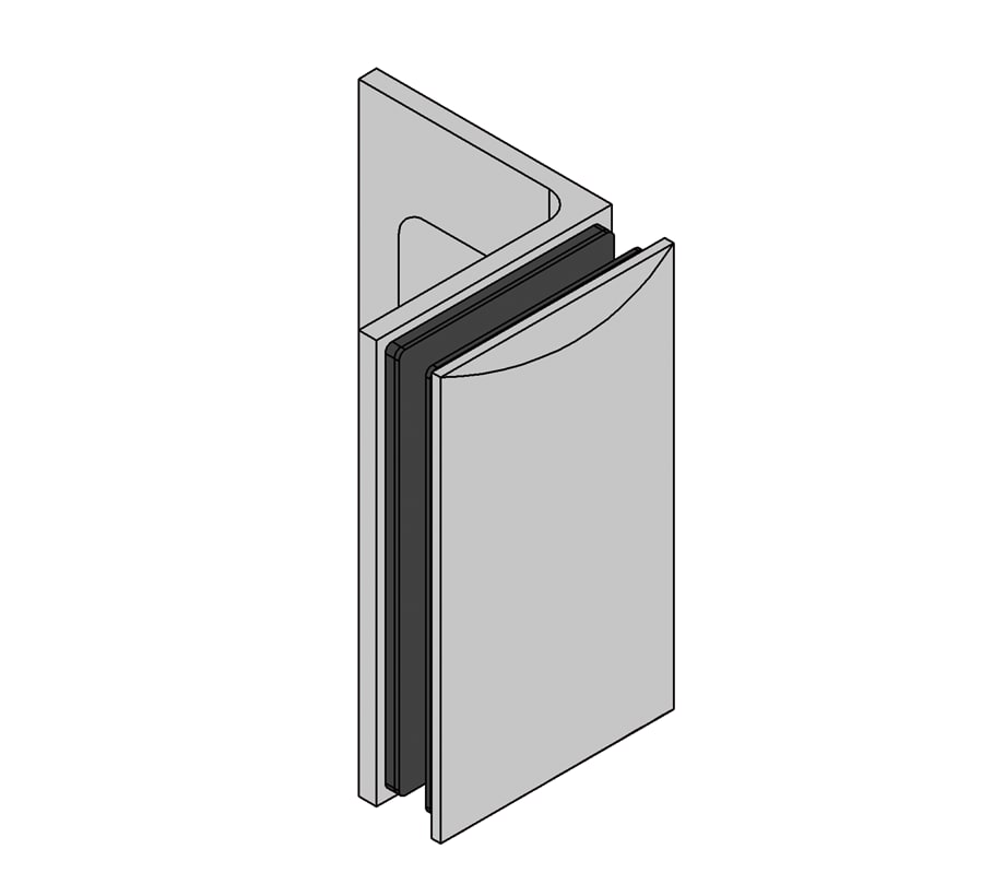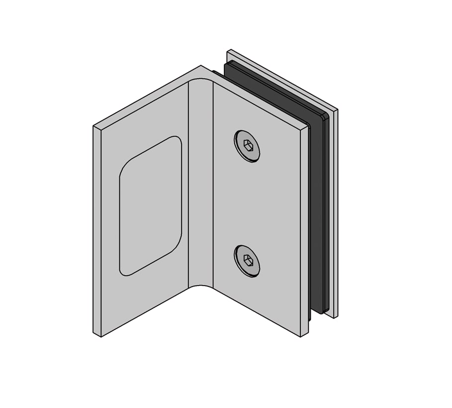 Art angle connector 90° glass-wall for connecting a fixed glass side panel to a wall.