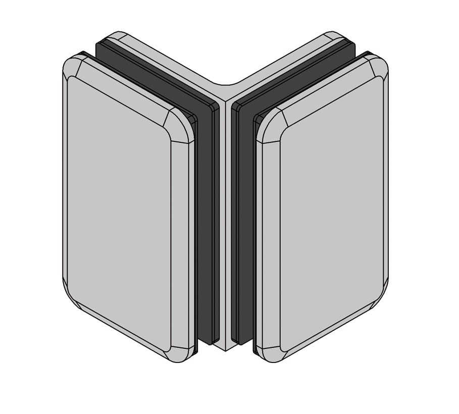 Barcelona 90° glass-glass angle connector for connecting two fixed glass side panels. Radii and large bevelled edges create an unusual design.