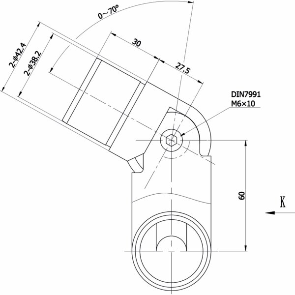 This angle connector, adjustable from 0 to 70°, enables a clean connection of the ø 42.4 mm round handrail to a stair railing.