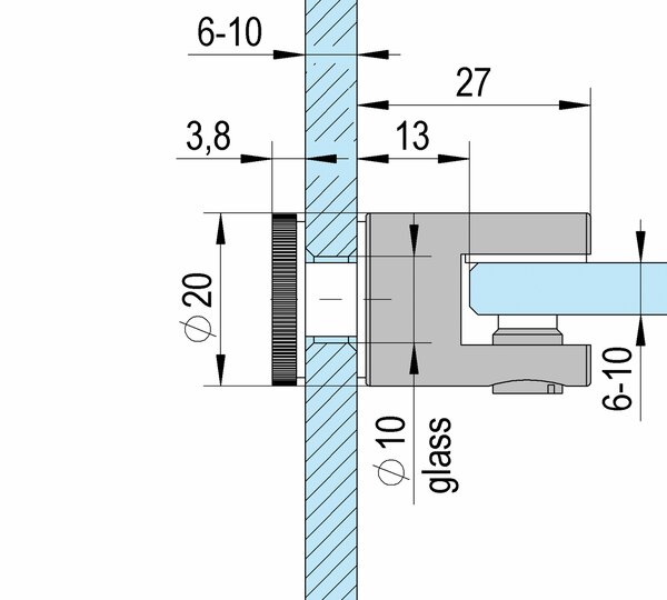 Glass shelf support made of solid brass for all-glass display cabinets. The individually adjustable clamp reliably prevents the glass shelves from falling down. A simple glass hole is sufficient for fastening. Supplied with plastic washers and sleeve.