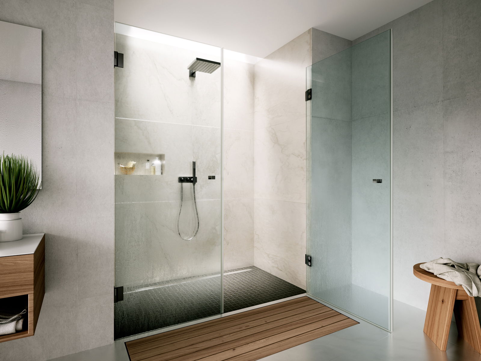 Both hinges feature cover caps with clip technology and are available in a choice of shiny chrome-plated, stainless-steel effect, or black. No disruptive screw fittings are visible on the classic, angular designs, making for a minimalist and contemporary aesthetic. The Arta FM also benefits from an adjustable zero position, which can be achieved using a screw located on the underside of the hinge. A raising/lowering function with 5mm lifting height also enables the shower door to close independently, achieving a better seal due to increased pressure.